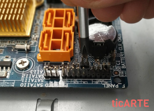 - Puenteando el pin CLR_CMOS (Clear CMOS jumper) durante unos segundos. Si no tenemos un jumper para hacerlo, podemos utilizar la punta de un destornillador para hacer el contacto entre los dos pines.